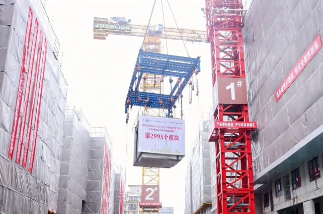 项目采用中国建筑国际集团旗下中建海龙首创研发的智能建造-MiC技术,将9栋住宅楼科学规划为2995个模块单元,在工厂完成结构、装修、水电、卫浴的一体化生产后,以“成品空间”的形式运输到现场进行装嵌,实现“像造汽车一样造房子”。